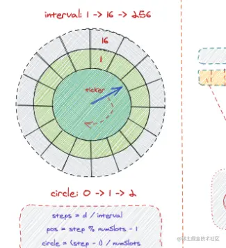 - 而在扩展时间上,采取 circle 分层,这样就可以不断复用原有的 numSlots ,因为定时器在不断 loop,而执行可以把上层的 slot 下降到下层,在不断 loop 中就可以执行到上层的task。这样的设计可以在不创造额外的数据结构,突破长时间的限制。