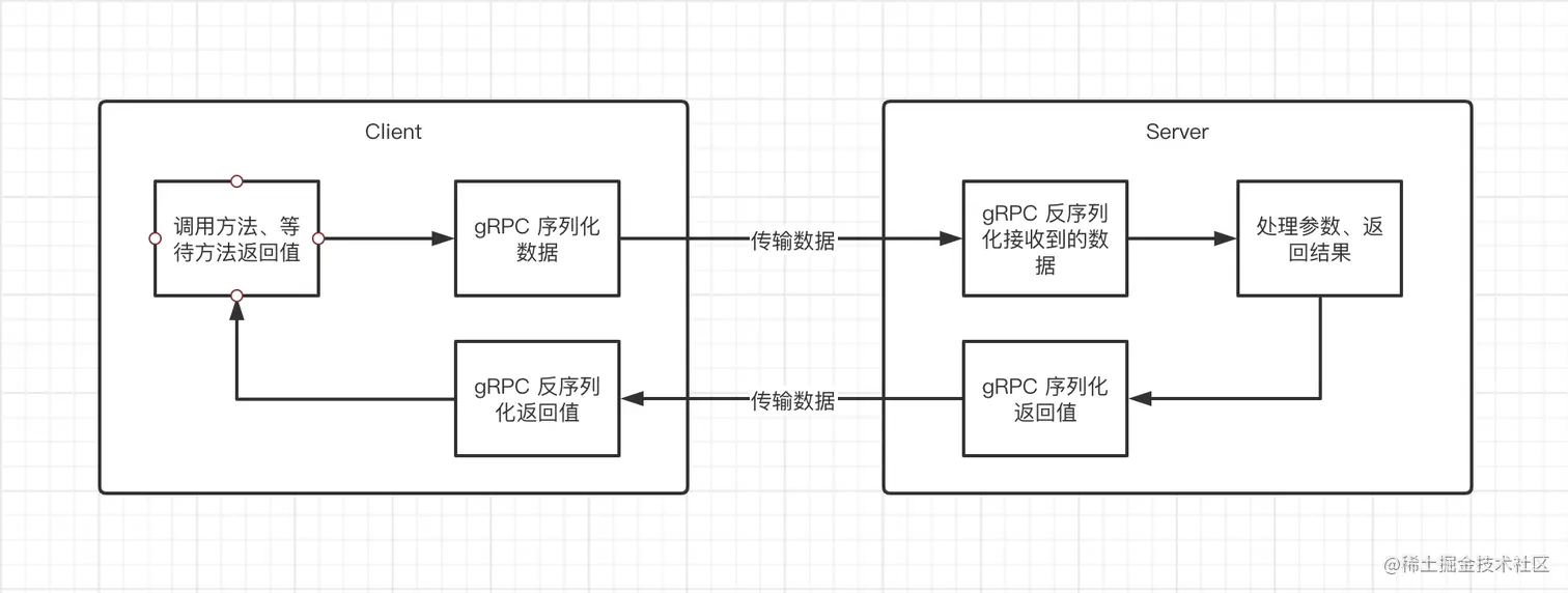 我所理解 RPC 整个执行的过程就是 Client 调用方法 -> 序列化请求参数 -> 传输数据 -> 反序列化请求参数 -> Server 处理请求 -> 序列化返回数据 -> 传输数据 -> Client 接收到方法返回值: