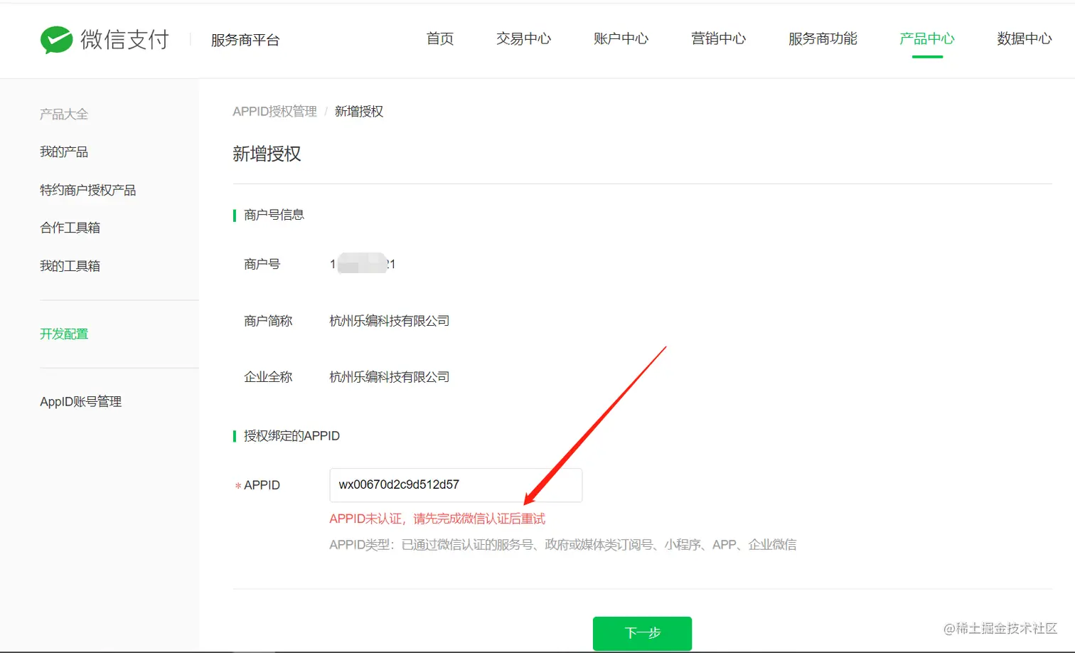 我们这个时候如果想直接做微信支付商户号关联,会提示如下错误。