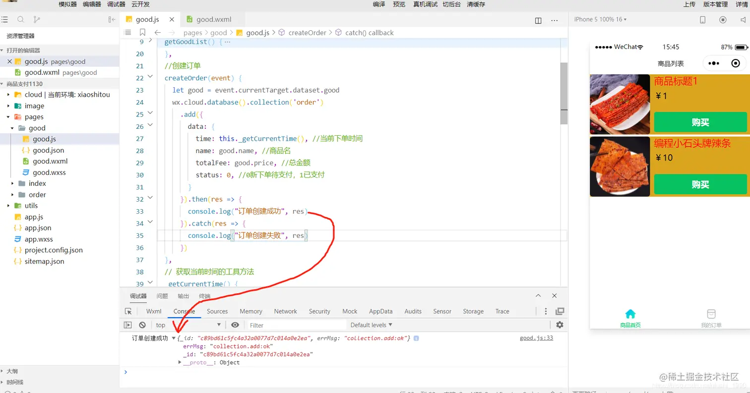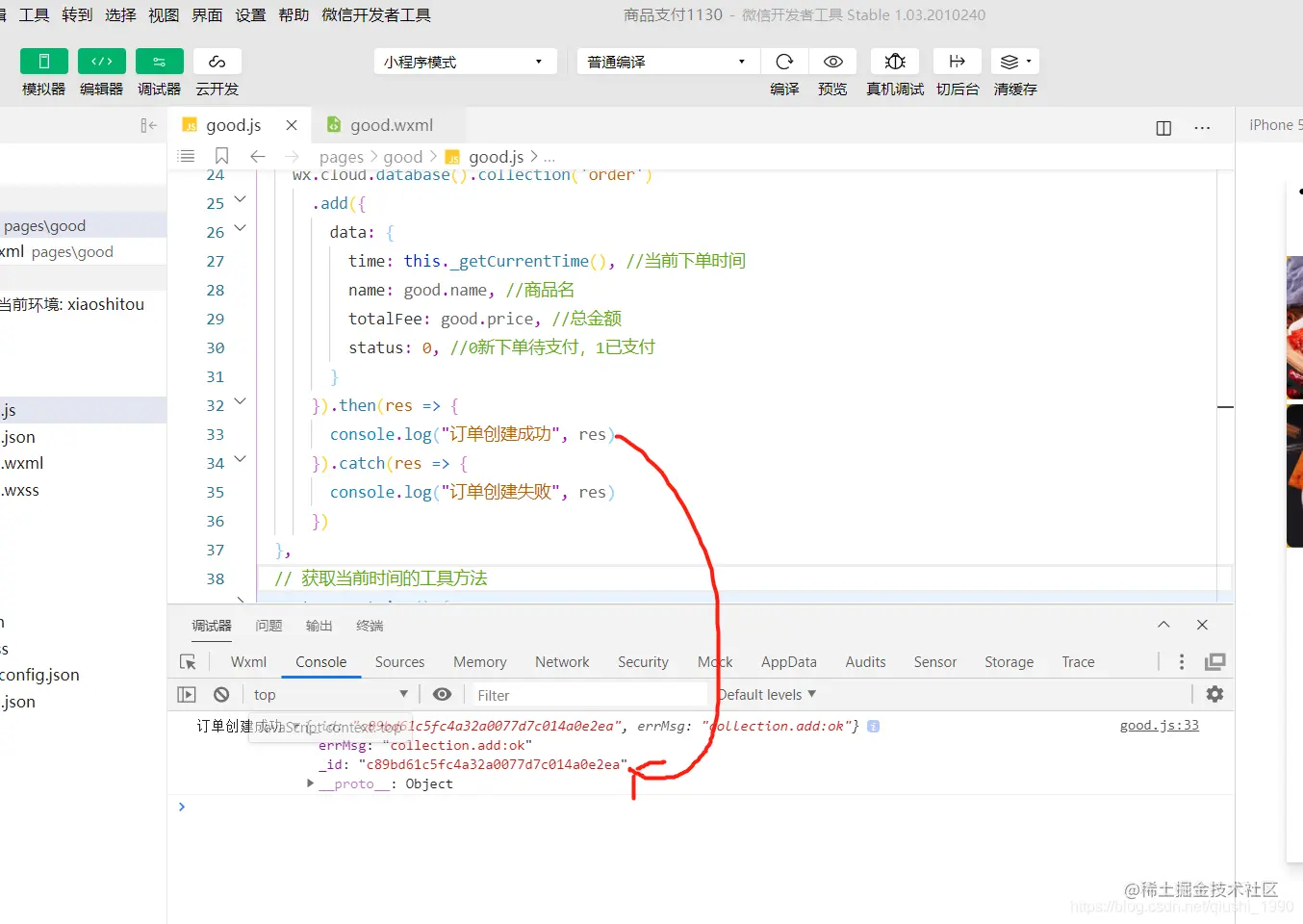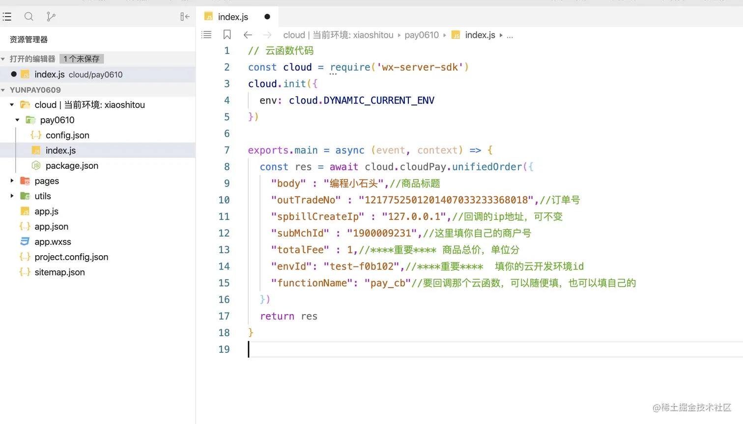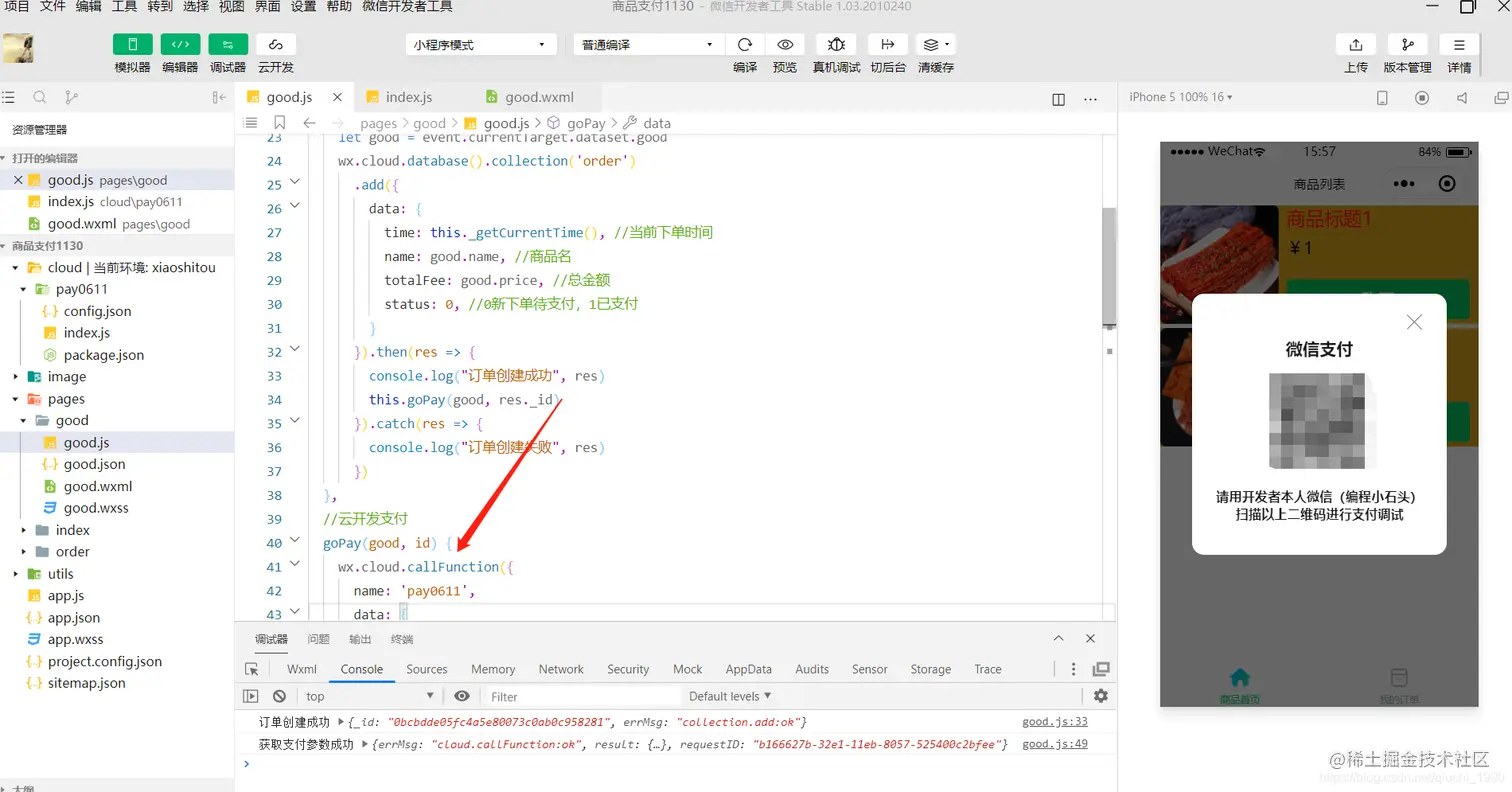 我们上面创建好订单以后,应该在订单创建成功的回调里调起支付。其实支付的代码和我们前面学习基本都一样,唯一变化的就是要把我们新建的订单id传给支付云函数,把订单id作为支付时的单号。