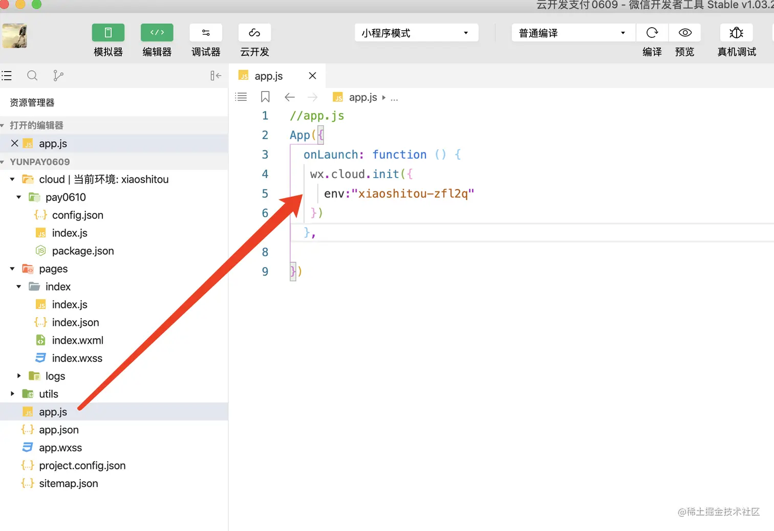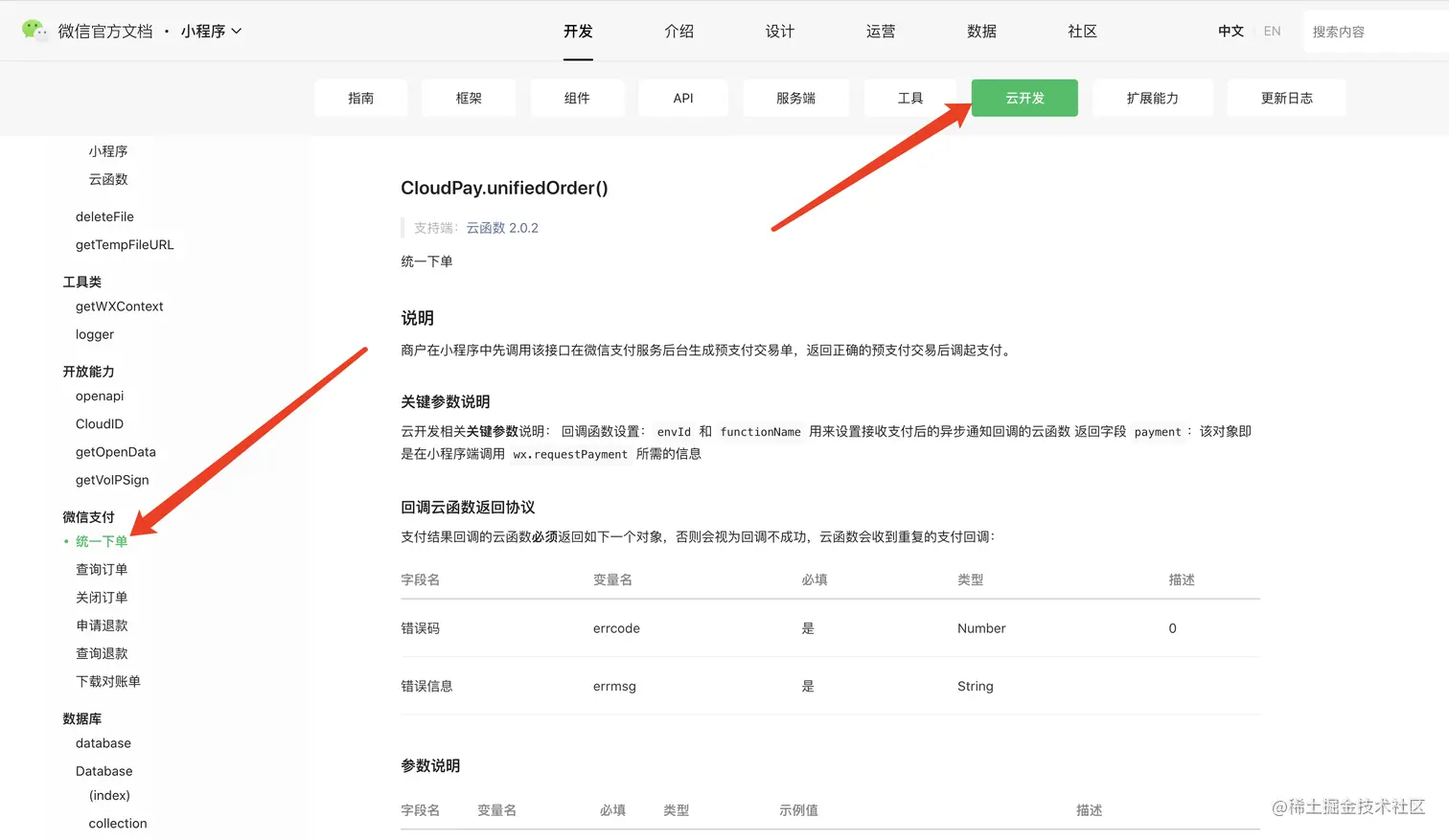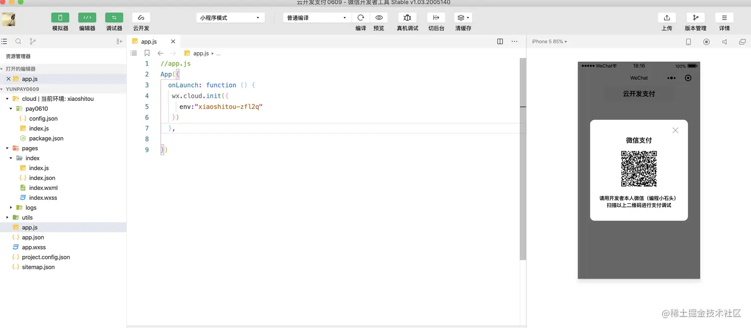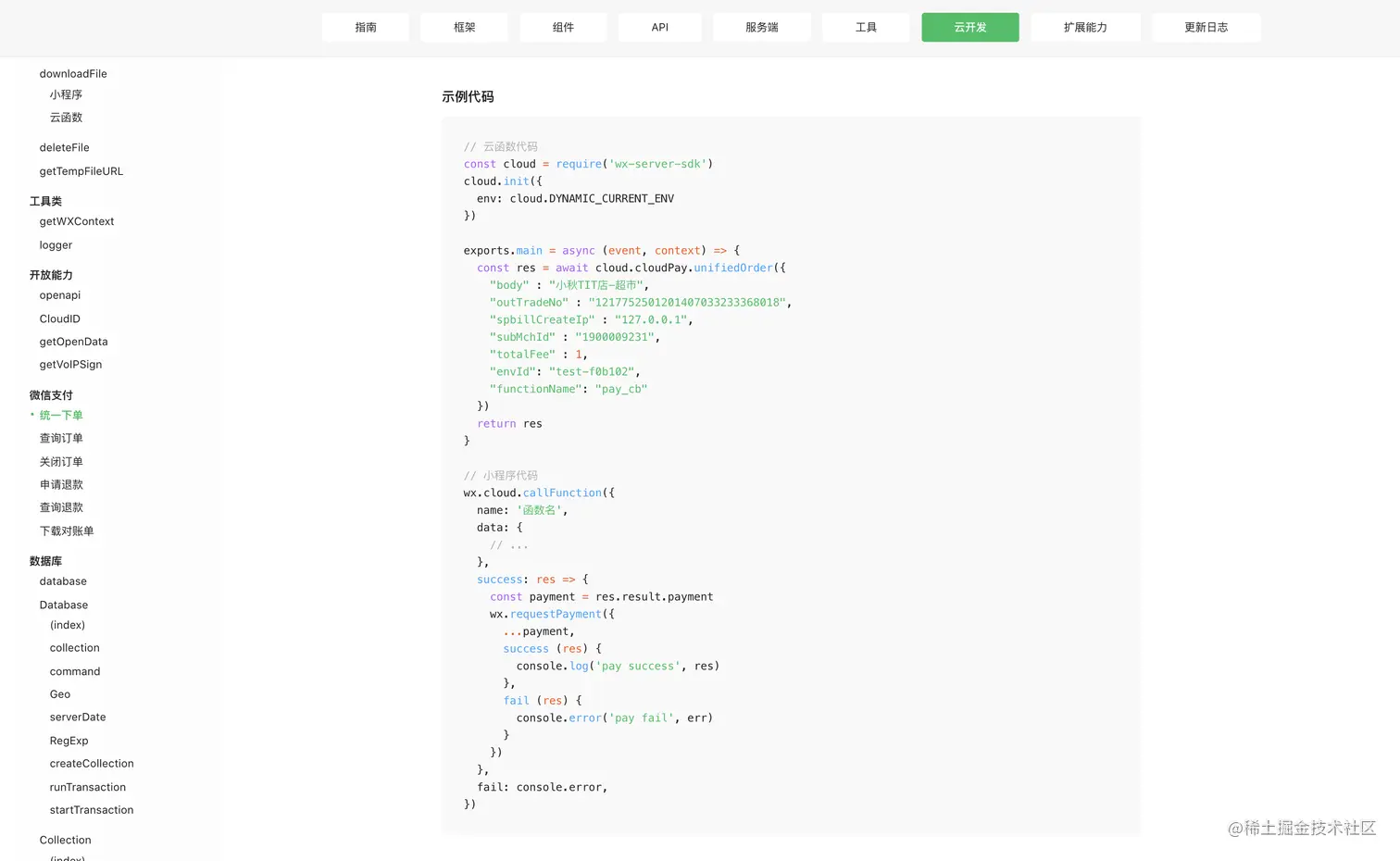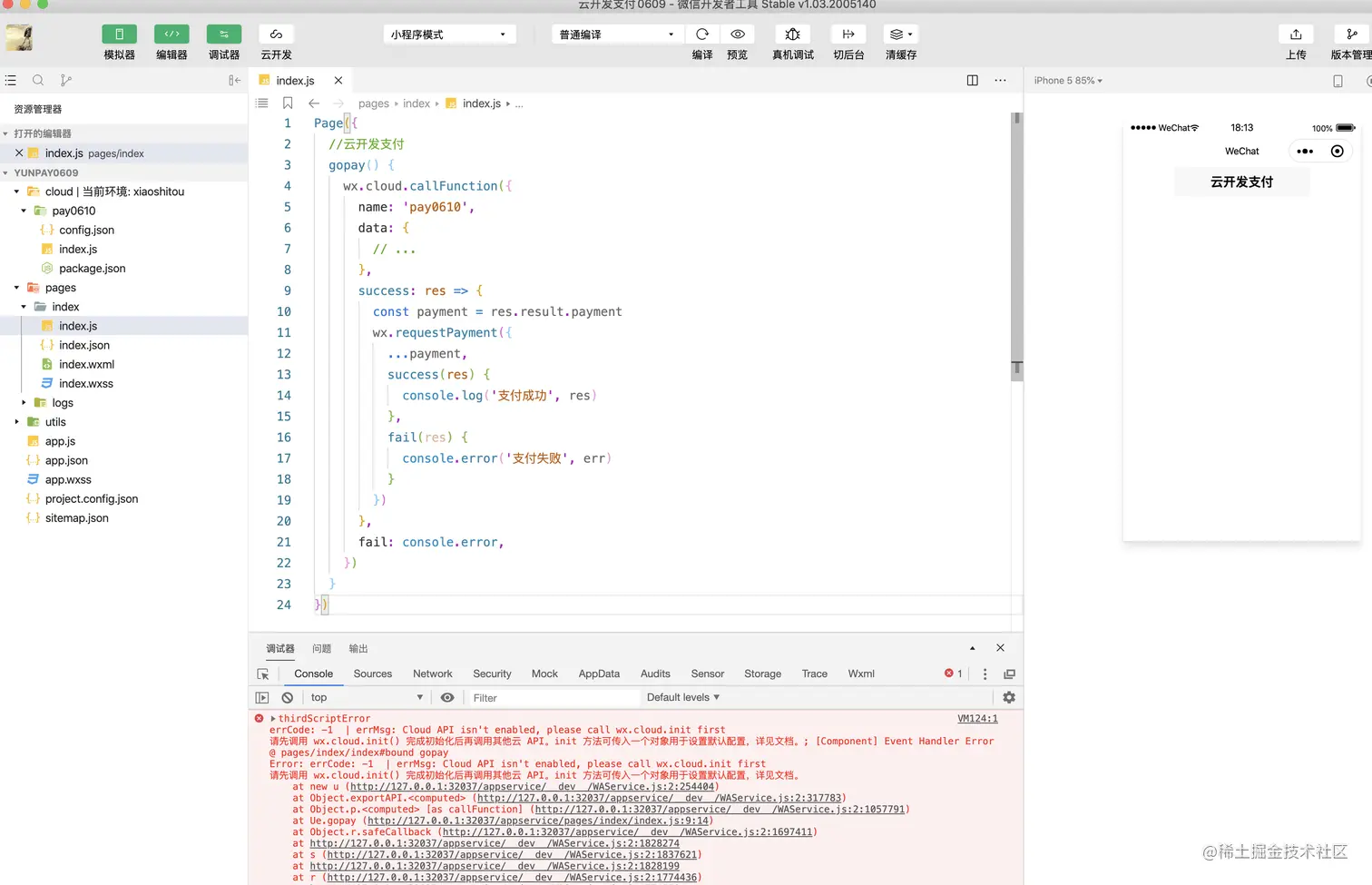 我们上面创建好订单以后,应该在订单创建成功的回调里调起支付。其实支付的代码和我们前面学习基本都一样,唯一变化的就是要把我们新建的订单id传给支付云函数,把订单id作为支付时的单号。
