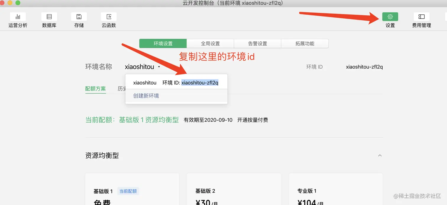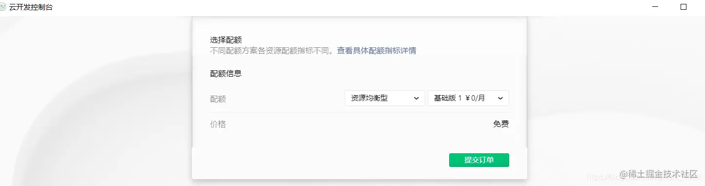 现在云开发只可以免费试用一个月,学习的话,一个月够了,所以这里支付方式,随便选一个就行了。下一步的选择配额,也随便选一个就行了,然后提交。