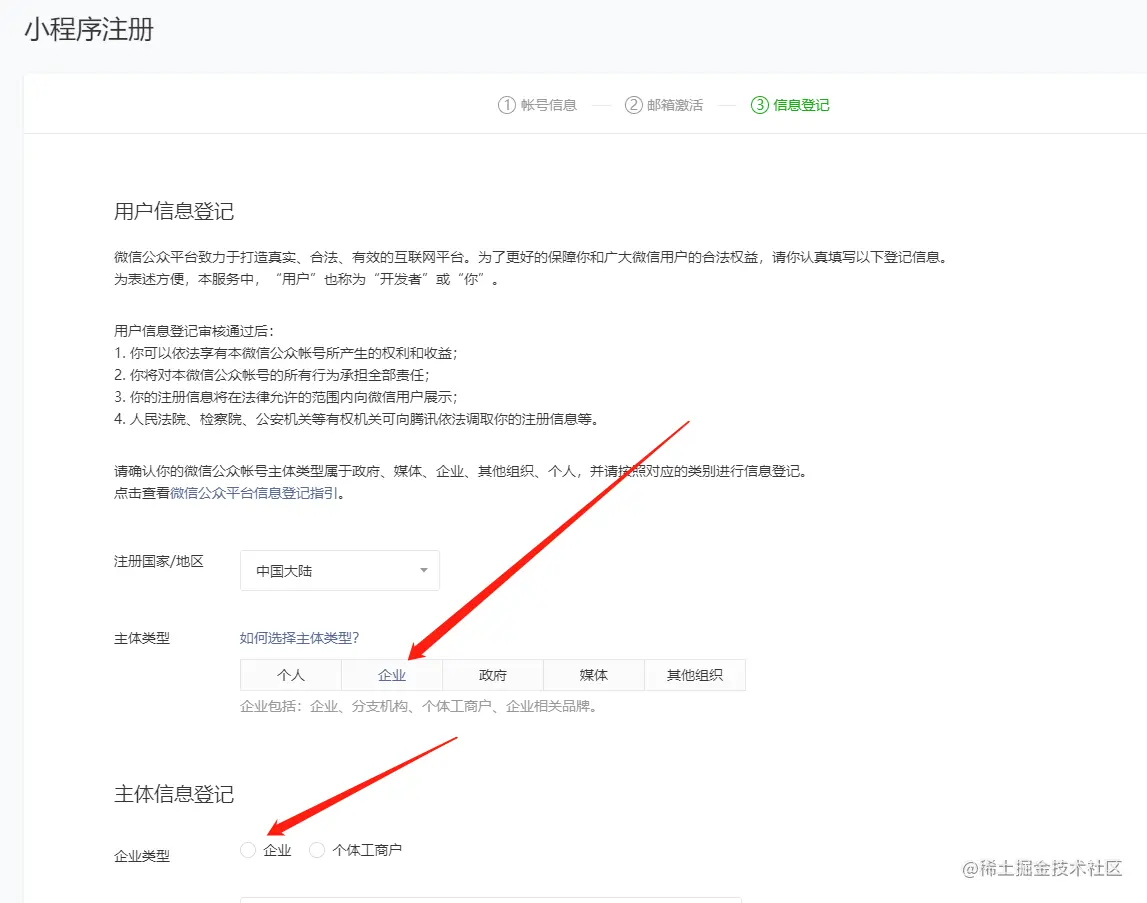 上面的邮箱验证成功以后,我们这里就要选企业了,当然如果你是个体工商户,你也可以选择个体工商户。