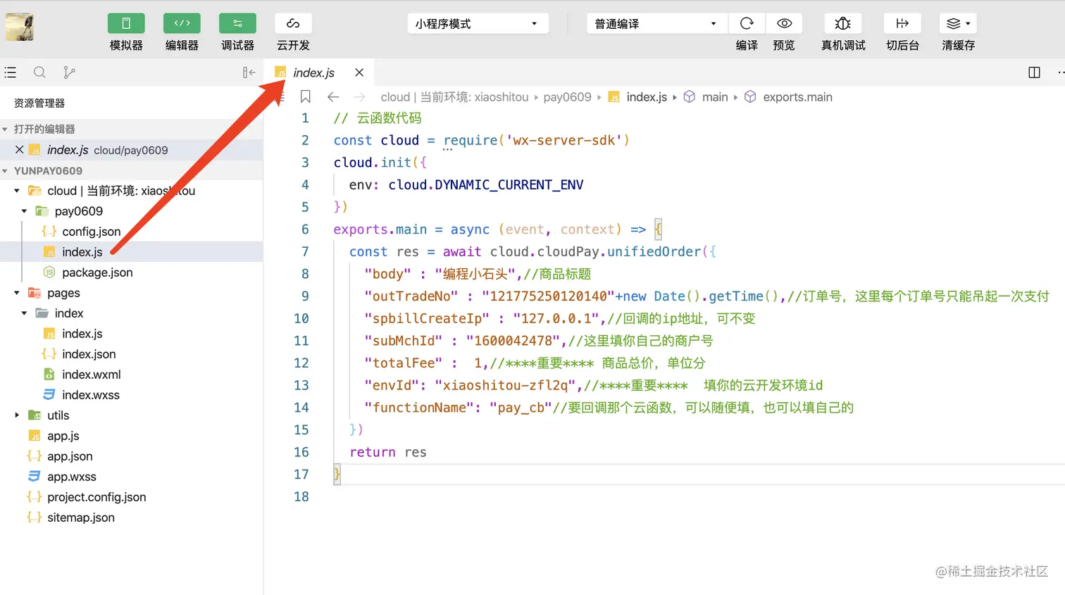 我们的pay0611云函数唯一的变化就是把订单号做成了活的。
