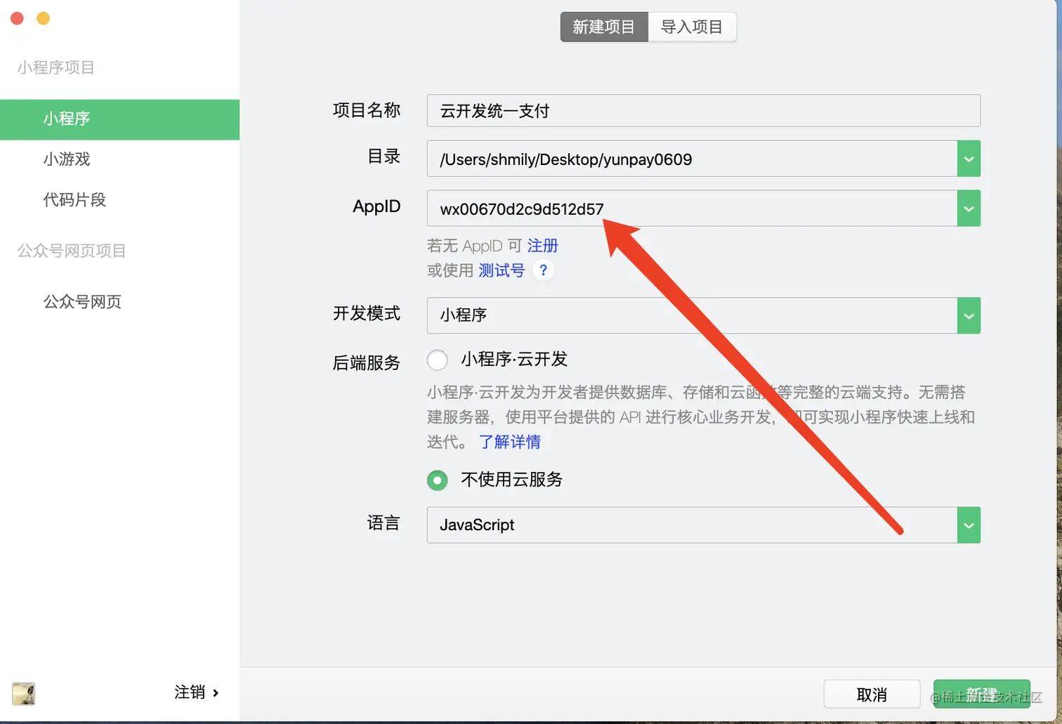 这里的appid一定要是你关联过微信支付商户的,并且还得是企业小程序。这里创建项目时记得选择不使用云服务,因为使用默认云开发的话,会创建一大堆无用的文件。