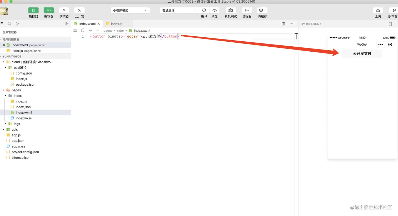 在index.wxml里写一个按钮,点击的时候调起我们的支付云函数