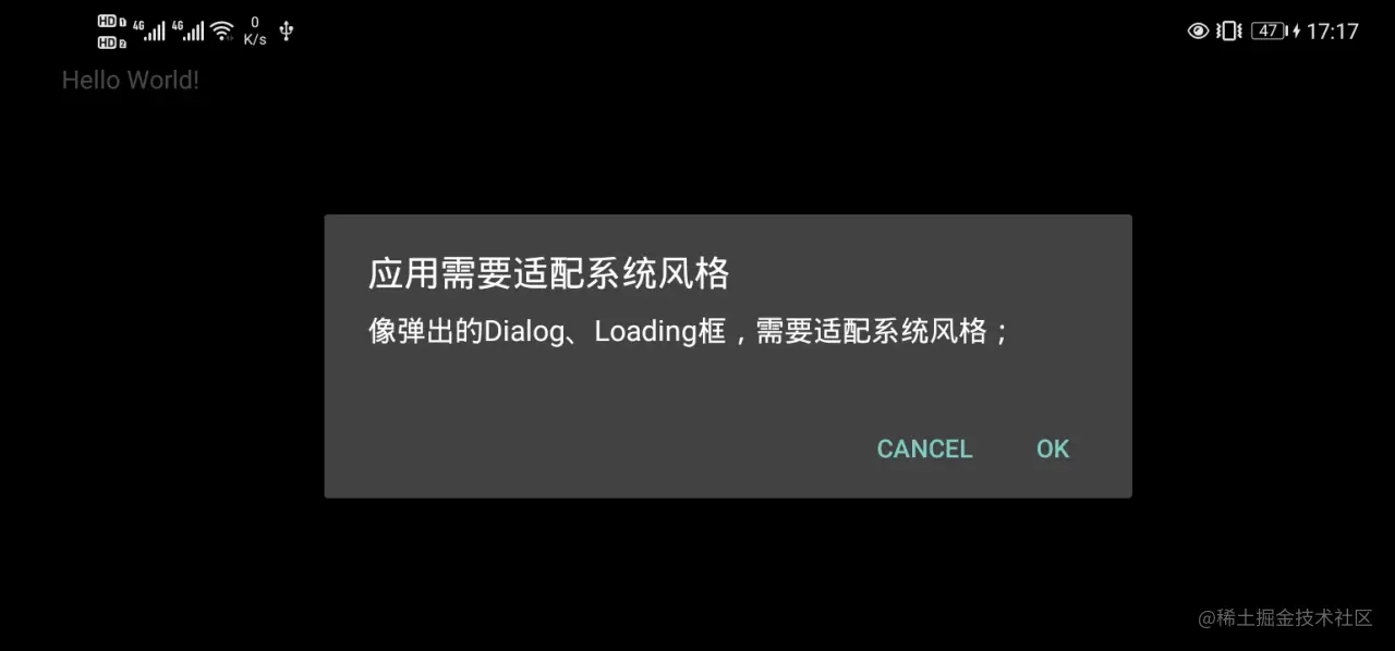 在应用里面弹出的Dialog、Loading框,需要适配系统风格!