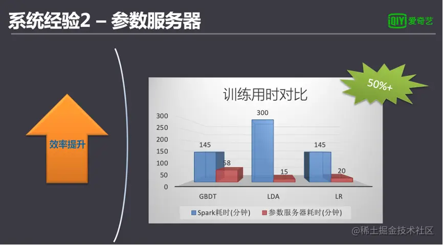 爱奇艺的机器学习平台在设计之初就支持跨算法框架调度。我们调研了多种开源的参数服务器,最终集成了腾讯的 Angel 参数服务器,并对一些典型模型做了测试。测试证明,在训练亿级以上规模的模型时,参数服务器的训练效率相对 Spark 有明显提升 50% 以上的速度。