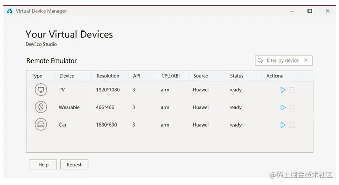 前边提到DevEco Studio可以使用远程虚拟设备进行调试:
