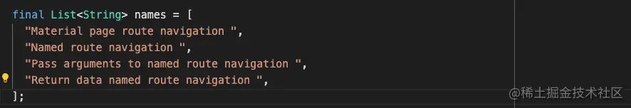 定义一个list,里面包含了导航的基本操作 1,Material page route navigation, MaterialPageRoute导航 2,Named route navigation, 命名路由导航 3,Pass arguments to named route navigation,使用命名路由传递参数 4,Return data named route navigation, 获取返回值