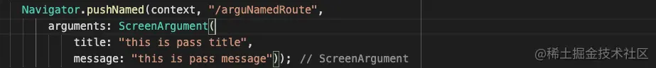 (三)使用命名路由传递参数,定义一个类ScreenArgument,包含两个属性title 和 message,跳转方法和命名路由方法一样,给arguments属性赋值