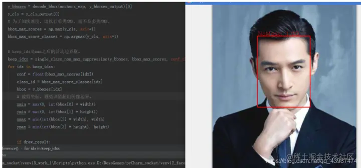 检测出胡歌没有带口罩。红色框框是圈出人脸部分,上方的字体:NoMask ,准确率 1 (即有100%把握认为没带口罩)