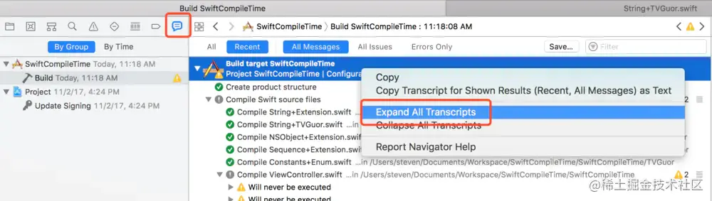 右击build log >> Expand All Transcripts 就可以看到编译时长的log了