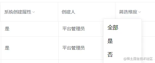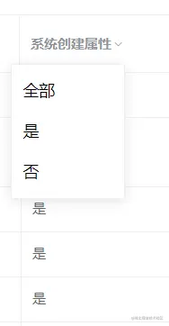 <el-table-column prop="from" label="系统创建属性" :filters="[ { text: '全部', value: '全部' }, { text: '是', value: '是' }, { text: '否', value: '否' }, ]" :filter-method="filterHandler"//筛选函数 filter-placement="bottom-end" //筛选框的位置 :filter-multiple="false" //是否多选?false代表否,默认不写为true ></el-table-column>