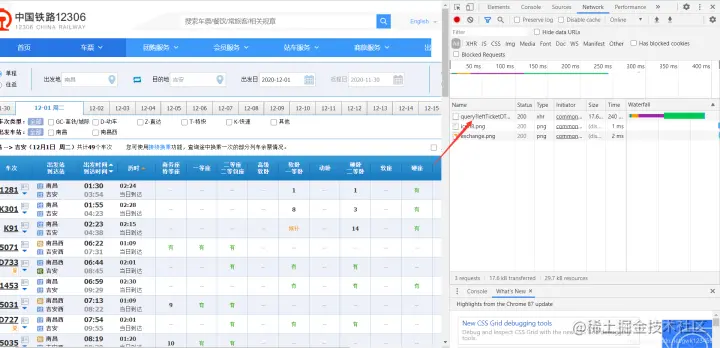(我使用的是谷歌浏览器,按F12快捷键可检查元素),然后选择右上方的Network,在左边的界面中输入你所需要查找的出发地和目的地以及出发日,然后点击查询,会出现如下界面