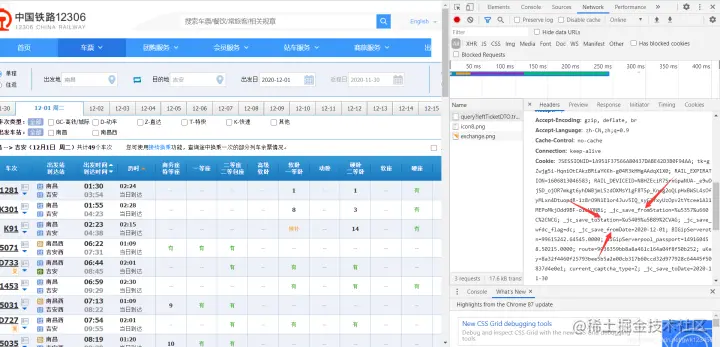 这里的出发站和到达站的输入cookies值,这个需要根据自己的情况去查找,这里给出查找步骤。登录之后,我们可以看到如下界面