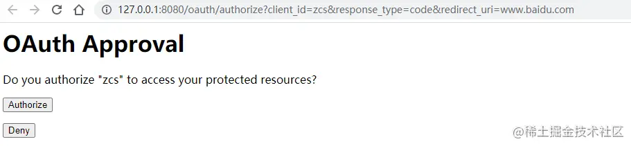 访问 http://127.0.0.1:8080/oauth/authorize?client_id=zcs&response_type=code&redirect_uri=www.baidu.com