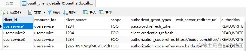 configure(ClientDetailsServiceConfigurer clients)我们指定了从数据库读取,方便维护,对应oauth_client_details表,客户端验证时会直接从库中匹配验证