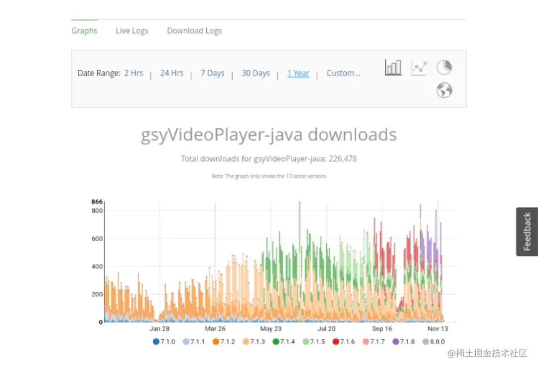而从 JCenter 的数据上来,GSYVideoPlayer 项目在这一年里下载量有 22 万+,比起去年的10多万+多了不少,这么看来 2020 年做视频相关产品的需求依然在不断增长。