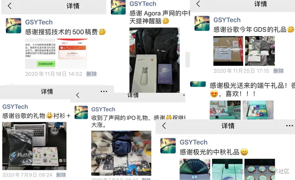 答案是明面上并没有,但是逢年过节会收到主办方或者平台的礼物,比如我现在的状态是:用着掘金的鼠标垫,捧着掘金的水杯,穿着掘金的卫衣,套着声网的外套,背着 Google 的包····对,我就是移动广告展位!。