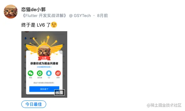 是的,今年年初也完成了另外一个小目标:LV6 ,作为后期专注 Flutter 的内容,能升级到 LV6 其实挺不容易的,虽然现在文章的阅读数已经有 90万+ ,但是其实增长并不快,同时因为其他事情的影响,如今文章的更新频率已经很低了,但是唯有沸点摸鱼是每日坚持的优良传统。
