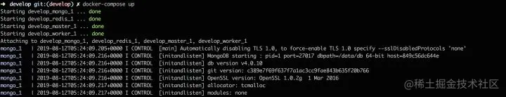 运行上述命令后,Docker Compose 会去拉取 MongoDB 和 Redis 的镜像,这可能会花几分钟时间。拉取完毕后,四个服务会依次启动,您将会在命令行中看到如下内容。