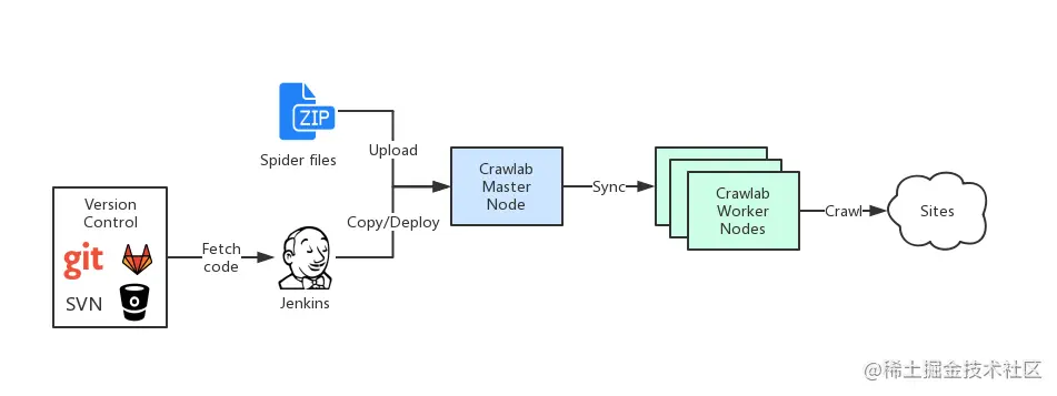 - 这样,每一次代码更新提交到代码仓库后,Jenkins 就会将更新后的代码发布到 Crawlab 里,Crawlab 主节点会将爬虫代码同步到工作节点,以待抓取。