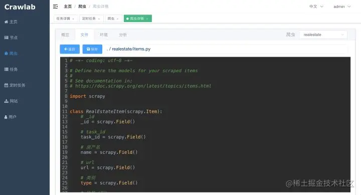 可以在爬虫详情中点击“文件”标签,选择一个文件,可以在文件中编辑代码。