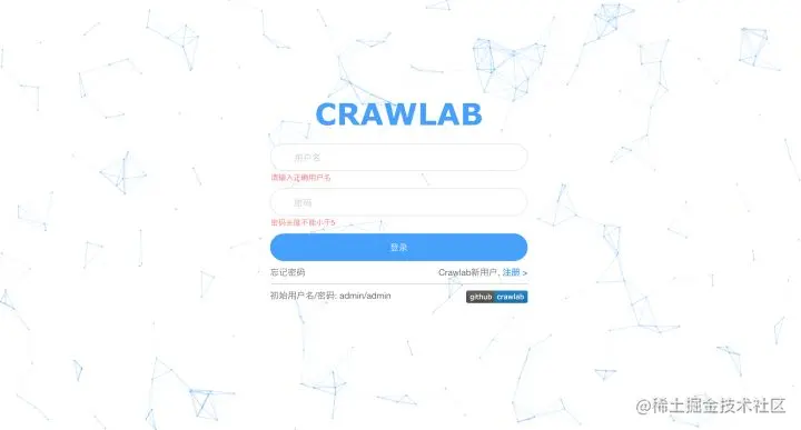 初始登陆用户名密码是 admin/admin,您可以使用这个用户名密码来登陆。如果您的环境变量CRAWLAB_API_ADDRESS设置得不正确,您可能会看到点击登陆后登陆按钮会一直转圈而没有任何提示。这时请重新在docker-compose.yml中设置正确的CRAWLAB_API_ADDRESS(将localhost替换为<your_ip>),重新启动docker-compose up。然后在浏览器中输入http://<your_ip>:8080。