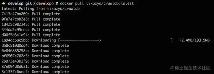 然后拉取镜像,就会快很多了。当然,您也可以用其他镜像源,可以网上去搜索一下。执行以下命令将 Crawlab 镜像拉取下来。