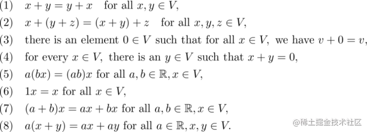 这是向量空间的原型模型。一般来说,如果可以将向量相加并将向量与实数相乘,那么这组向量 V 就是实数上的向量空间,那么以下属性成立: