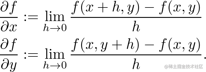 在单变量中,导数是切线的斜率。那么在此应该如何定义切线呢?表面上的一个点处不只有一条切线,而是多条。这些切线中有两条特殊的切线:分别为平行于 x-z 平面的切线和平行于 y-z 平面的切线。