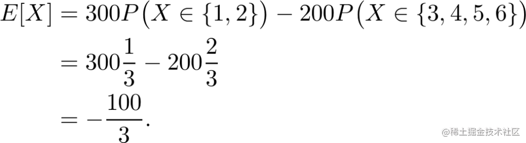 假设你和朋友玩游戏。你掷一个经典的六边形骰子,如果结果是 1 或 2,你将赢得 300 美元。否则,你就输 200 美元。如果你玩这个游戏的时间够长,你每轮的平均收入是多少?你应该玩这个游戏吗?