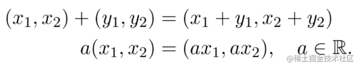 这些本质上是从零指向(x₁,x2)的向量。向量之间可以相加,向量也可与标量相乘: