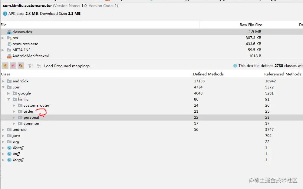 使用类加载的原理是,当打成apk包的时候,所有的组件和类都打包在了一起。如下图所示:从order往personal跳当然是可以通过全类名找到相应的类的。其实ARouter的原理也跟这一样。