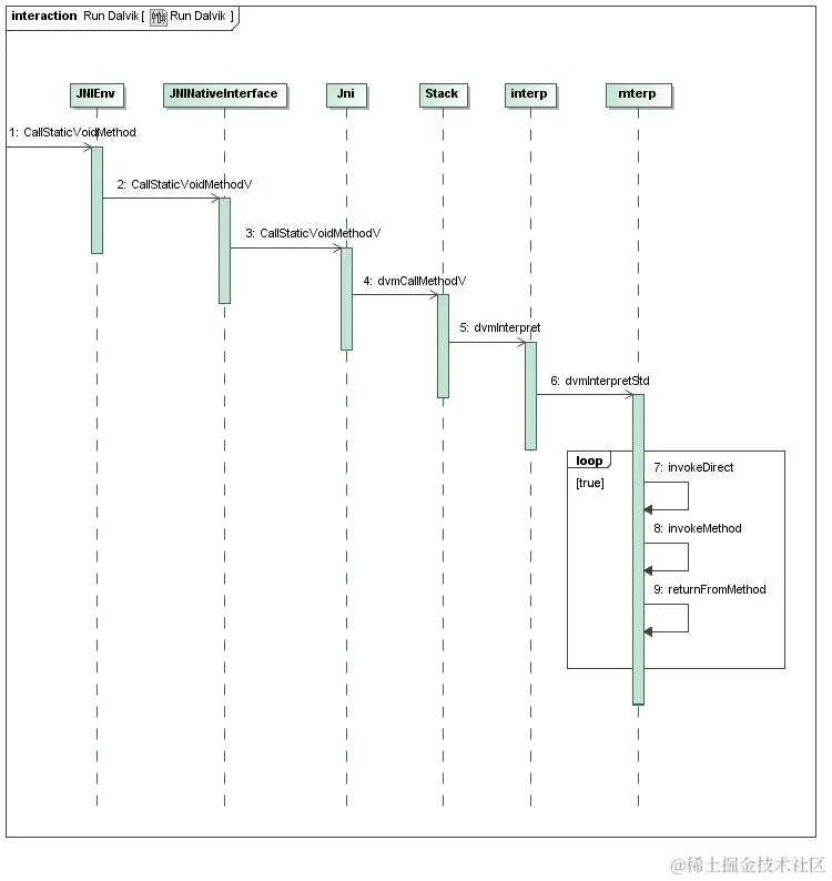 如果成员函数methodToCall不是一个JNI方法,那么就说明接下来仍然是要通过Dalvik虚拟机解释器来执行它。不过这时候需要将当前线程激活的栈帧fp设置为newFp,以及将程序计数器pc指向成员函数methodToCall的方法区。最后通过宏FINISH(0)来跳出当前分支,实际上就是跳出前面Step 6的switch语句,然后重复执行while循环语句。此时传递给宏FINISH的参数为0,表示不需要调整程序计数器pc的值,因为前面已经调整过了