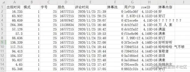 可以看到,一共**「11471条」弹幕,我们获取到了「11000条」**,占比已经很高了,而且csv文件已经安静地躺在了我的电脑中,打开它: