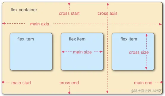 项目默认沿主轴排列。单个项目占据的主轴空间叫做main size,占据的交叉轴空间叫做cross size。