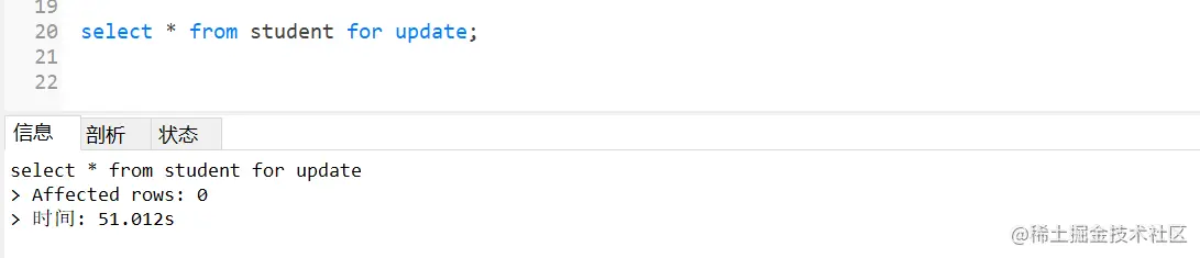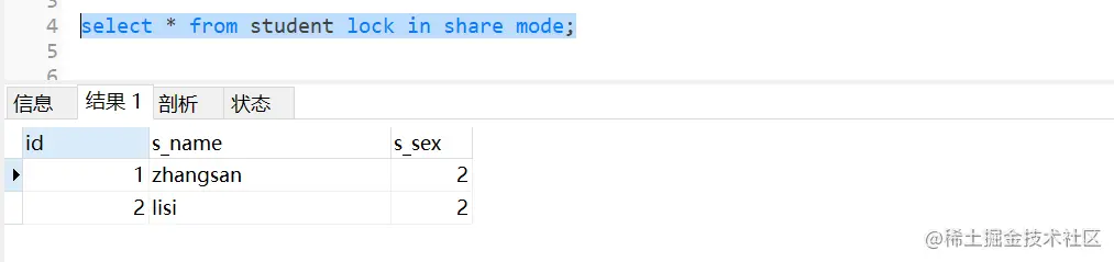 发现是可以执行的,其实在上一步去执行修改的操作时大家也看到了,并没有手动的加s锁,只不过在执行CUD操作时,默认会加x锁(for update)。加了s锁后,是不允许其它事务对此加x锁的,所有形成了等待超时的错误。