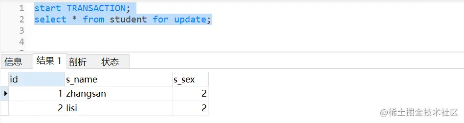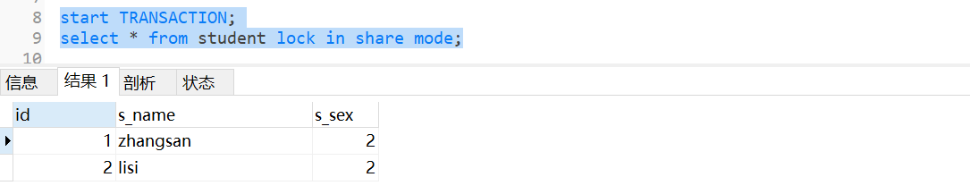 注意,此时对该事务加的是共享锁,且并没有提交事务。