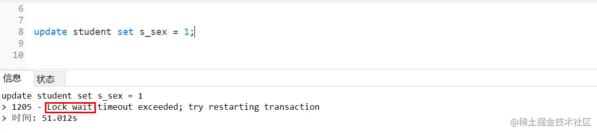 尝试在新的查询窗口中执行CUD操作,等待一段时间后发现获取锁超时,证明在其他事务中不可以修改s锁