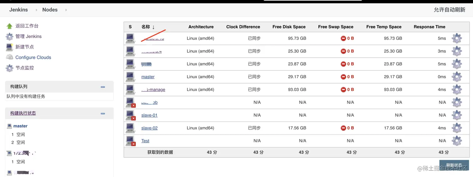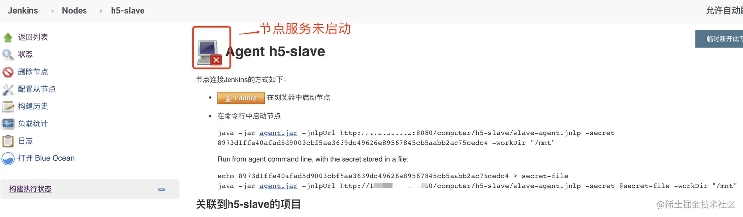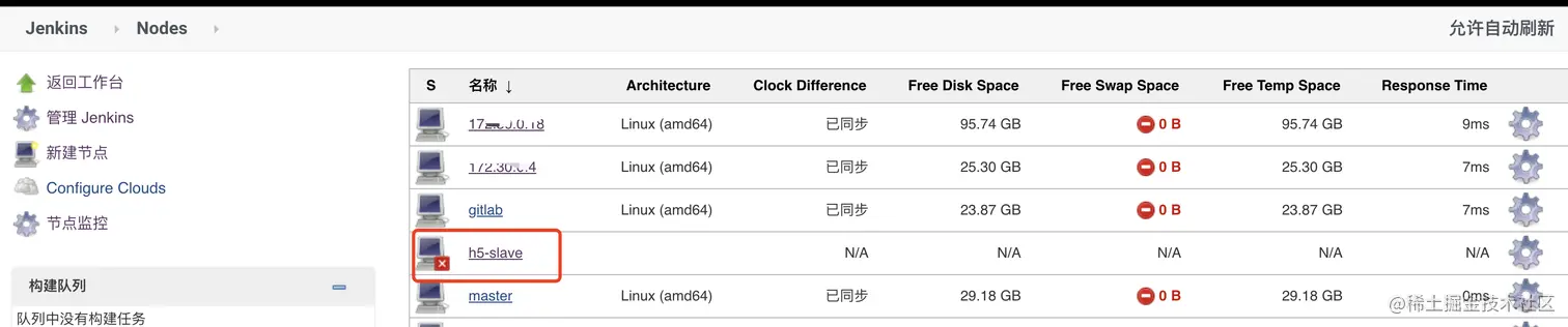 我们可以发现外面刚才见 h5-slave节点 有个红色的叉,表面该节点不可用。服务还没启动。此前无法作为jenkins构建。