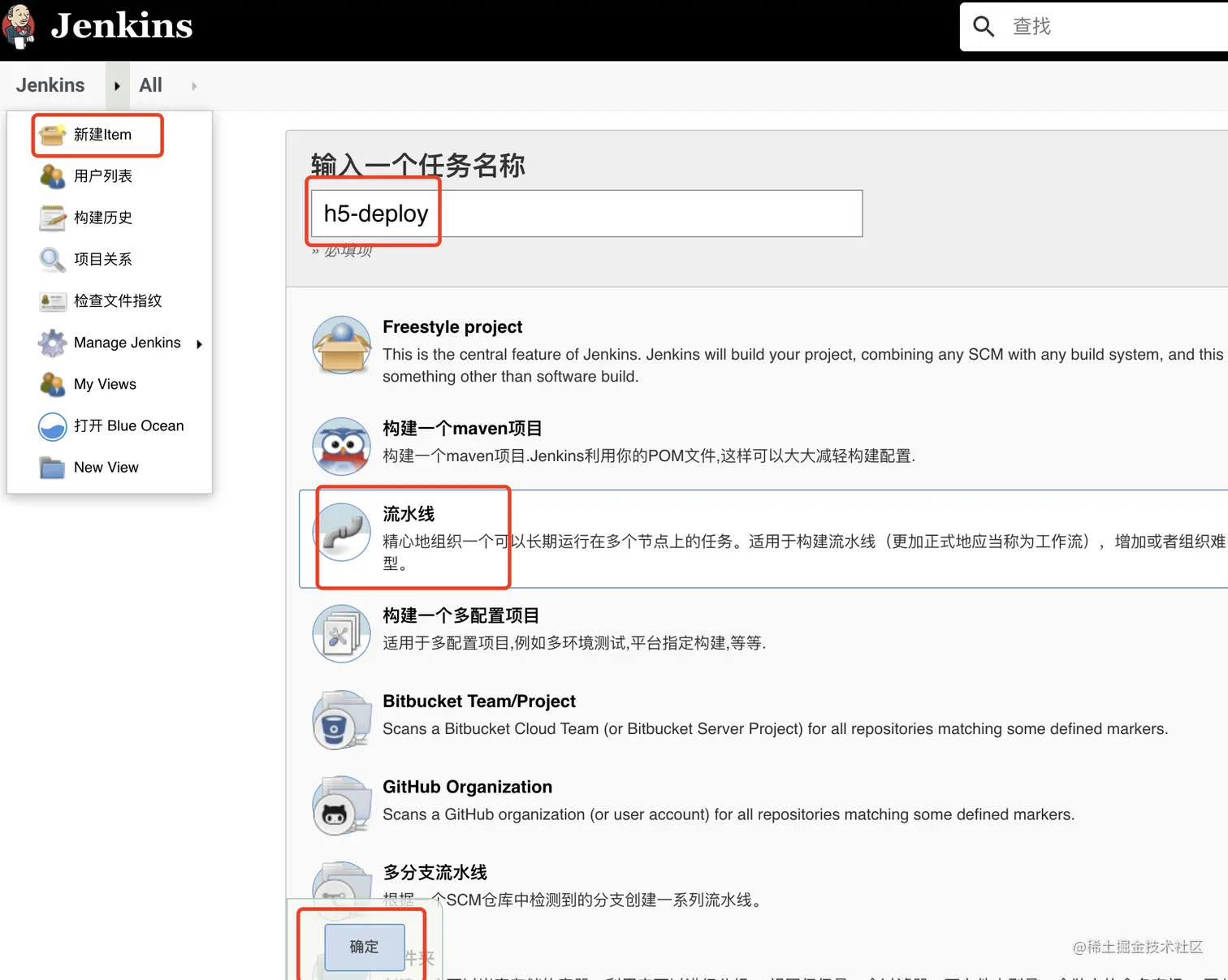 - 1、【jenkins】 -->【新建item】-->【流水线】,点击确认