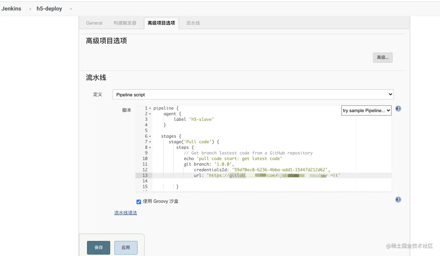 - 3、第一个步骤,一般都得指定git地址和分支、以及jenkins全局配置的credentialsId 这样才能拉取到制定分支的最新的代码。