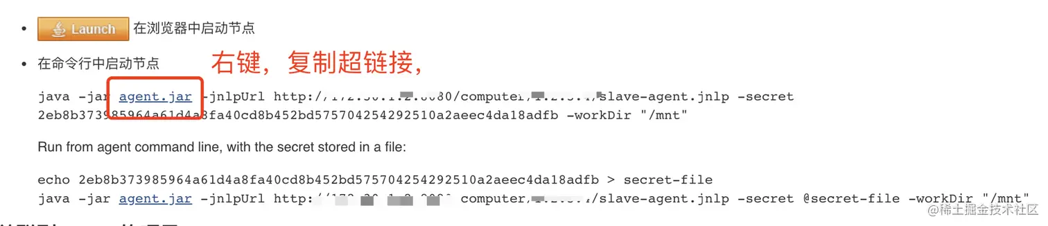 java -jar agent.jar -jnlpUrl http://xxx.xxx.x.x:8080/computer/h5-slave/slave-agent.jnlp -secret @secret-file -workDir "/mnt"