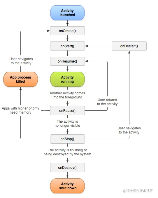 Activity A 启动另一个Activity B,回调如下: Activity A 的onPause() → Activity B的onCreate() → onStart() → onResume() → Activity A的onStop();如果B是透明主题又或则是个DialogActivity,则不会回调A的onStop;