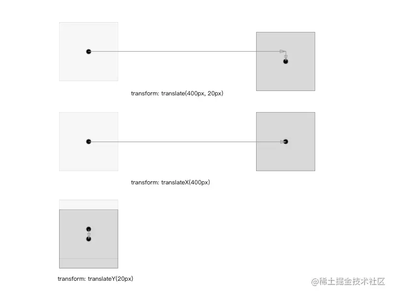 移动也分三种情况:translate(<translation-value>[, <translation-value>])、translateX(<translation-value>)和translateY(<translation-value>);分别代表水平和垂直的移动、水平方向的移动以及垂直方向同时移动,移动单位是 CSS 中的长度单位:px、rem等;