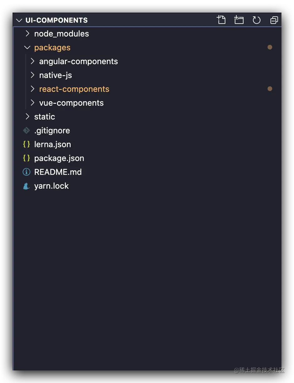 要为不同的框架生成对应组件,就需要打包出不同的 npm 包,且 native-js 版的组件依赖 React 版组件,其他版本组件依赖 native-js 版本的组件,所以决定把所有包都放在一个仓库中进行管理,采用lerna + yarn workspace来管理工作流。通过 lerna add pack1 --scope=pack2 就能实现本地包之间的相互依赖,通过 lerna run xx --stream,lerna 会按依赖拓扑顺序依次执行各个包中的命令,这个在打包时是必须的。同时 lerna version 能够统一管理包的版本,若某一个包的版本通过此命令改变了,依赖此包的其他包中的 package.json 中的版本号也会对应修改。最后的项目结构如下: