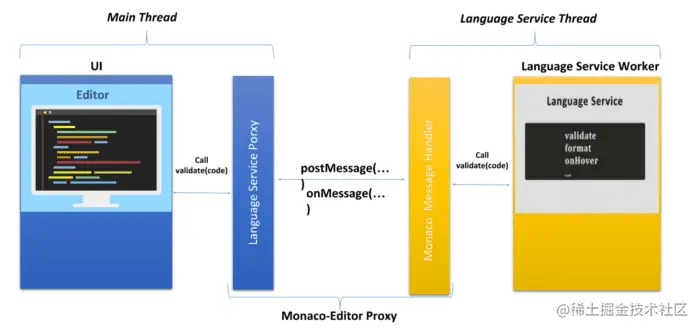Monaco 提供了一个API monaco.editor.createWebWorker 来使用内置的 ES6 Proxies 创建代理 Web worker 。使用 getProxy 方法获取代理对象(语言服务)。要访问语言服务工作者中的任何服务,我们将使用此代理对象来调用任何方法。所有方法都将返回 Promise 对象。