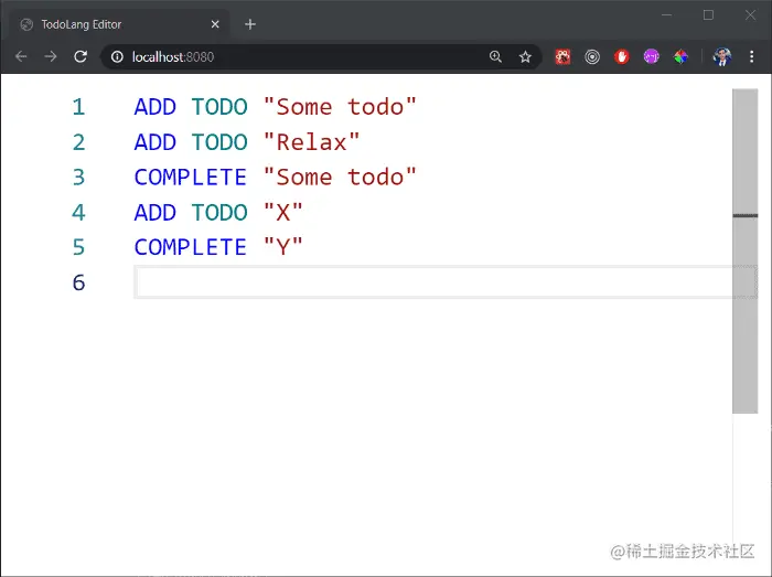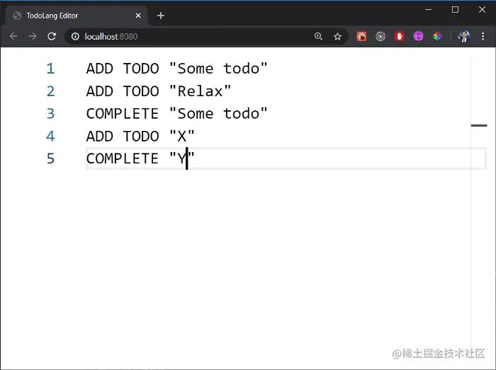 你是否想知道Visual Studio(Online),CodeSandbox 或 Snack 等 Web 编辑器如何工作?还是您想制作自定义的 Web 或桌面编辑器而又不知道如何开始? 在本文中,我将介绍 Web 编辑器是如何工作的,并且我们将创建一个自定义语言。 我们要构建的语言编辑器很简单。它声明一个 TODO 列表,然后将一些预定义的指令应用于它们。我将这种语言称为 TodoLang。以下一些示例是这个语言的说明: